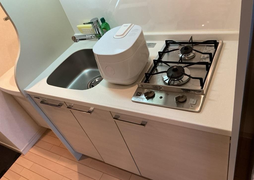 キッチン類お玉、まな板、ガスキッチン、ガスコンロ、キッチン洗剤、システムキッチン、スポンジ、スポンジ入れ、フライパン、フライ返し、三角コーナー、食器類、鍋、布巾、包丁、ボール・ザル